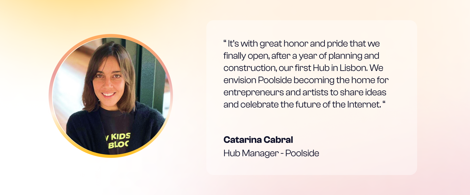 "We’ve been active in Web3 for many years now, and have helped over 100 projects launch with our team of mentors and advisors and did all of this digitally. For us, opening a physical space is investing in bringing Web3 builders together to accelerate innovation. Therefore it’s with great honor and pride that we finally open, after a year of planning and construction, our first Hub in Lisbon. We envision Poolside becoming the home for entrepreneurs and artists to share ideas and celebrate the future of the Internet."